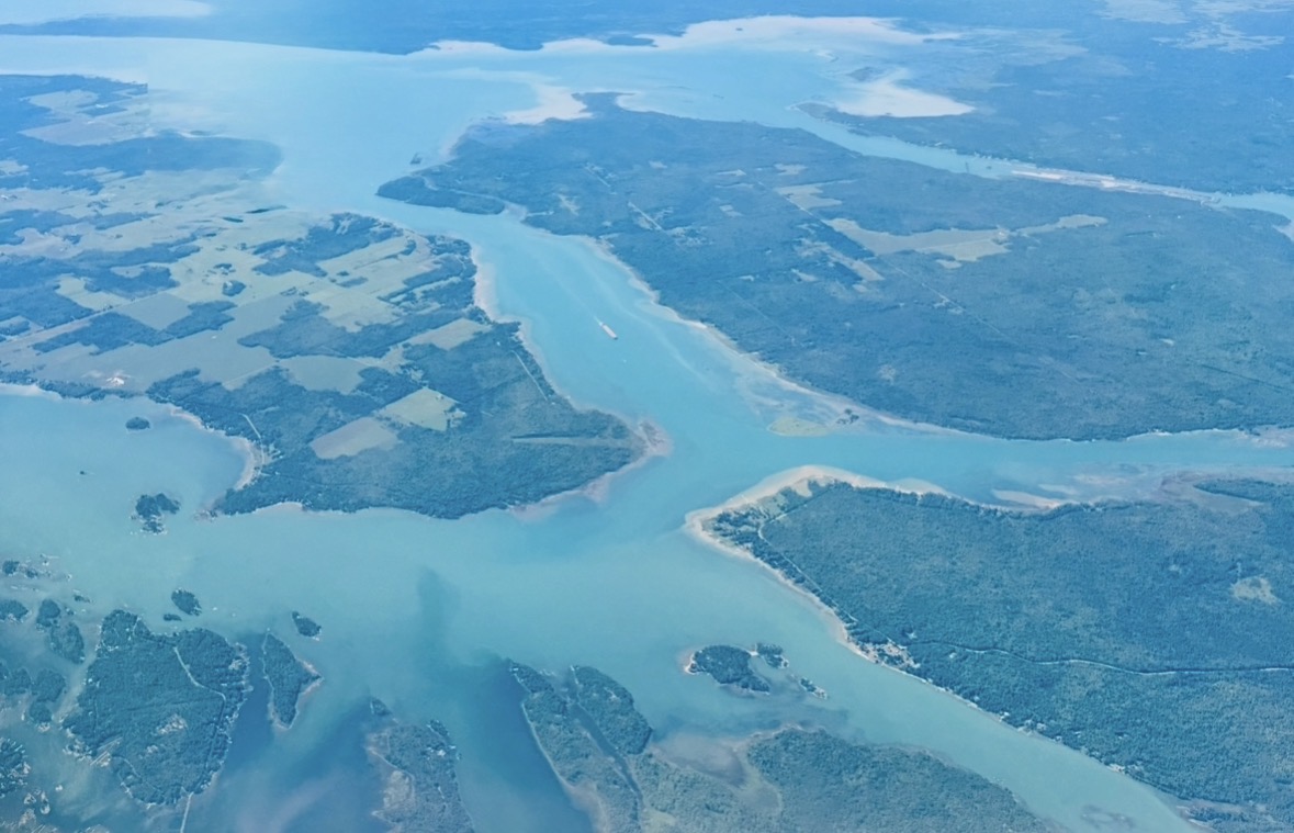 Arial photo of the St. Mary’s River in Sault Ste. Marie. Sault Ste. Marie, Ontario. Great Lakes Water in Action.Lindsay Rogers.